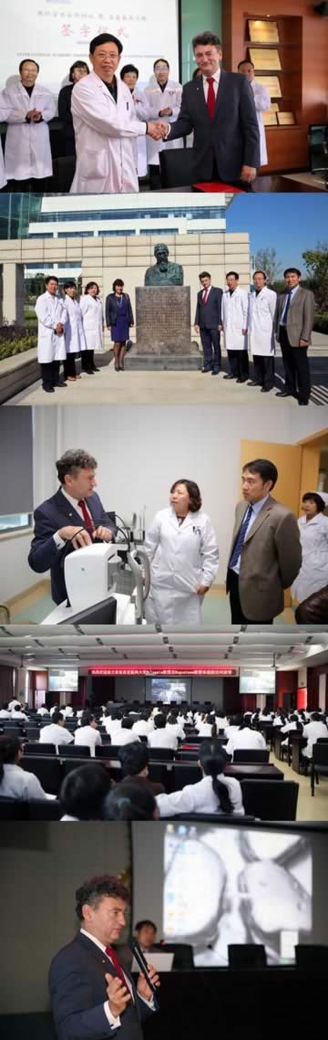 博古斯拉瓦教授在张铭连、吴彦超等的陪同下,瞻仰了宣尉仁铜像并合影留念。尔后,他还参观了我院角膜病科、红十字眼库、激光治疗科、口腔颌面外科、院史陈列室。在角膜病科,博古斯拉瓦教授认真的观看了该科的检查设备,并亲自为角膜移植患者进行术后检查。他说:“你们的角膜移植手术做的真棒”。在院史陈列史,他们被我院齐全的史料、年代久远的五官科检查器材及详实、准确的记载所吸引,不时的拿出相机拍照留念。