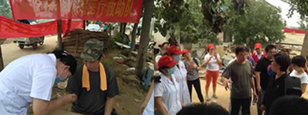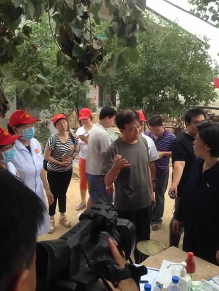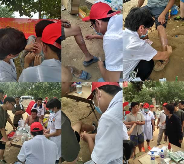 昨天,经市卫计委驻村领导张博义书记同意,我院救助队根据现场情况,分为两组:一组留在原东汪村卫生室继续进行救助工作,另一组开赴东汪村受灾重地——被洪水冲毁的村东养殖厂,现场为参加救灾的群众与志愿者进行现场治疗。因大家救灾心情急切,不愿耽搁一点儿时间,加上连日高温,许多参加救灾的人员身上出现了皮疹,还有的人小创伤只是自己简单处理了一下伤口,没有规范治疗,我院医疗队到现场后,立即展开工作。趁着救灾人员吃饭间隙为他们处理伤口,涂摸治疗皮疹、痱子的药剂,因需要处理的人多,工作量大,四位医护人员直到1点多才吃上了志愿者送来的盒饭。