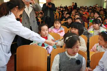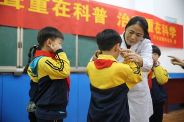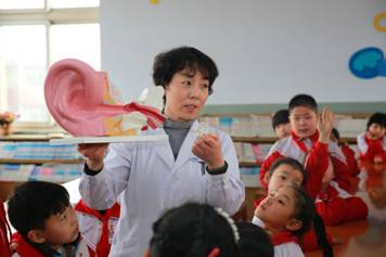 “医生阿姨,我游泳后耳朵进水,歪着头单腿蹦,水就可以出来”,“不大声听耳机可以保护耳朵”,“自己不能掏耳朵,要去医院找医生掏”。同学们的回答此起彼伏,得到小奖品的孩子更是兴奋,现场的气氛十分热烈。李素敏带孩子们一起做耳保健操更是把现场活动推向了高潮。