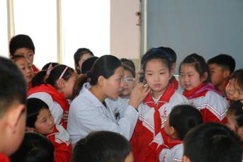 贺玲为逸夫小学的小同学做耳科检查