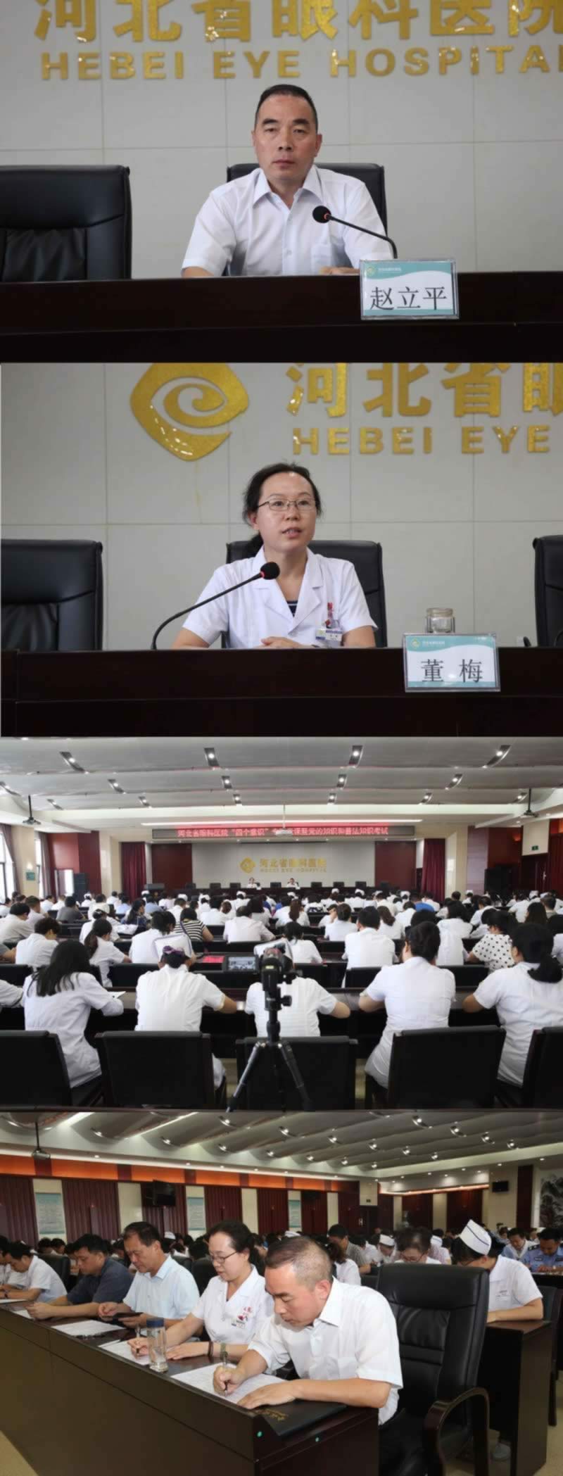 ——我院召开专题党课学习、警示教育暨知识考试2017年6月23日下午,河北省眼科医院党委在综合楼五楼学术报告厅组织全体党员开展“四个意识”专题党课学习和警示教育,医院300余名党员干部参加了学习教育。党委副书记赵立平为全体党员上了题为“增强‘四个意识’,争做合格党员和优秀医务工作者”的党课,纪检书记董梅做了题为“知敬畏、存戒惧、守底线”的警示教育讲话。