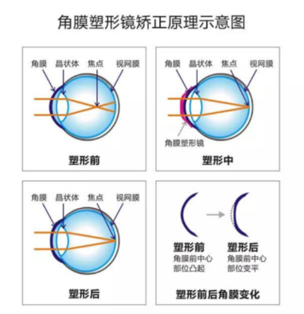 周边视野远视性离焦导致了眼球增长和近视发生。而角膜塑形镜不仅使视网膜中心视野获得清晰的物象,而且可以降低周边20°视野范围的近视度数,25°以外的视野范围呈近视离焦化转移,减缓了眼轴的增长。研究表明青少年近视眼配戴框架眼镜平均每年近视增长0.68D,而配戴角膜塑形镜平均每年近视增长0.16D。