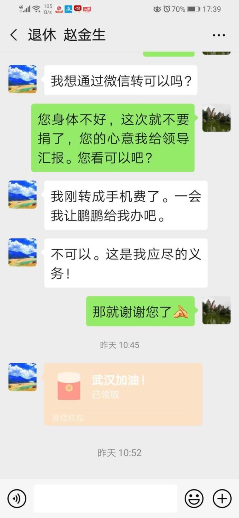 当老干部们得知捐款支持新冠肺炎疫情防控的消息后,大家积极响应,纷纷通过现金、微信等方式慷慨解囊、倾情捐助。老干部党支部副书记李庆伟介绍,他和冯虎仁副书记的电话自通知发出后接踵而至,有的老同志多次打电话确认其儿女代捐的钱是否到账,有的老同志委托其他老同志再次捐款。大家表示疫情防控人人有责,要为打赢这场没有硝烟的疫情防控阻击战贡献自己的力量。