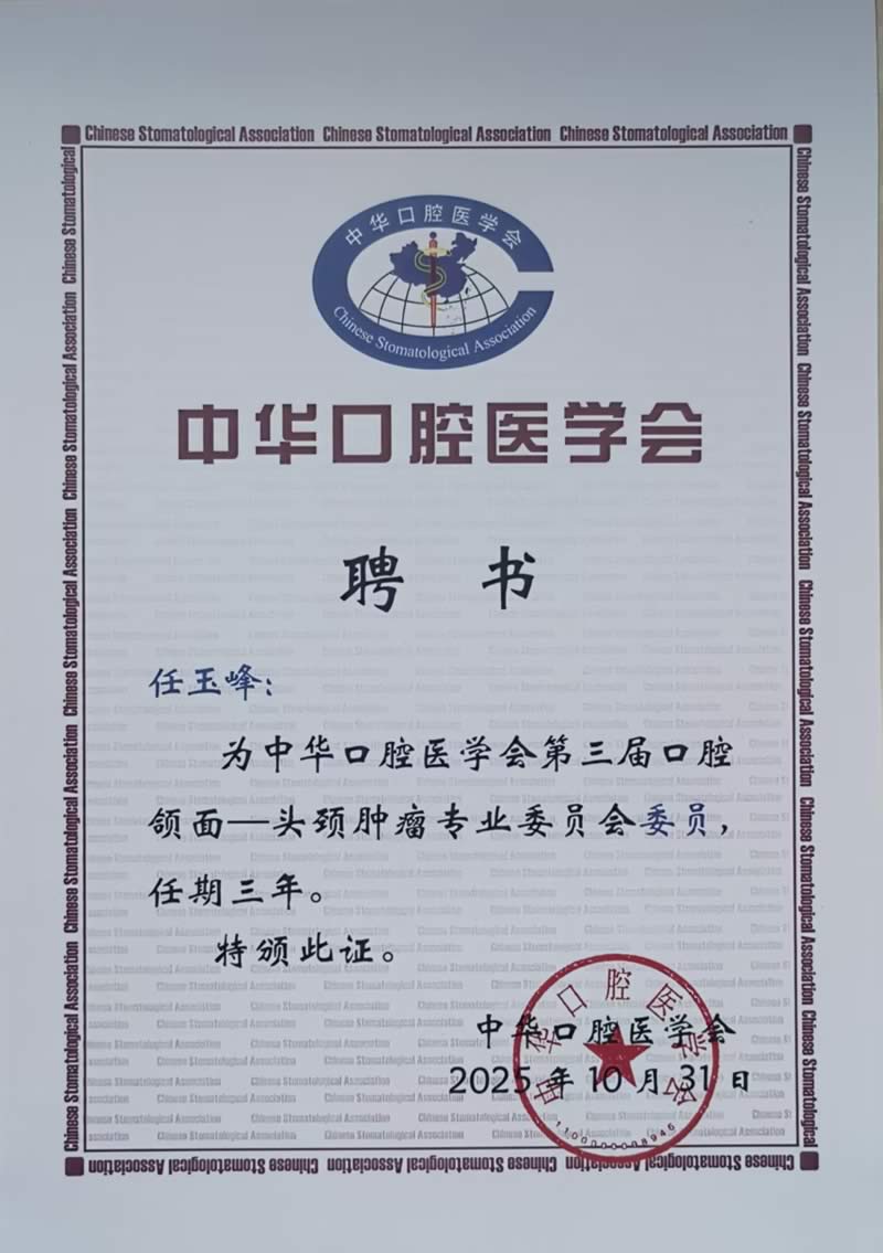 我院口腔颌面外科任玉峰主任再次当选为中华口腔医学会口腔颌面-头颈肿瘤专业委员会全国委员