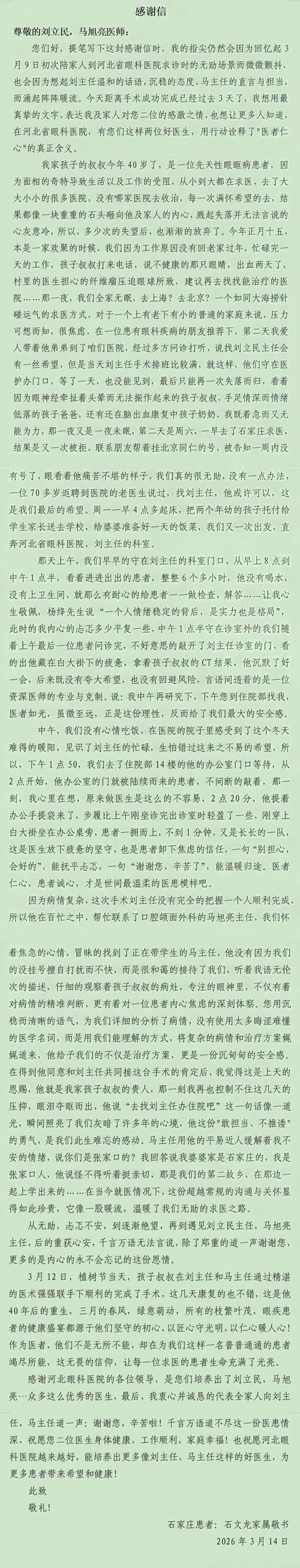 “从无助、忐忑到重获心安,这是他40年后的重生。”患者家属在感谢信中写道,“作为医者,他们不是无所不能,却在为我们竭尽所能。这无畏的信仰,让每一位求医的患者生命充满光亮。”