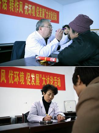 我院在不断巩固和拓展党的群众路线教育实践活动取得成果的基础之上,紧扣“学讲话、转作风、优环境、促发展”的大讨论活动主题,结合工作实际,主动服务社会,于11月8日上午,走进市桥东区天一城社区,为社区及附近居民进行免费五官科检查和健康咨询。当日上午9时,在天一社会居委会,我院眼科专家宁俊恩,耳鼻喉科专家吴秀云等一行3人,利用手中的便携式检查器械,有条不紊的为这里的居民进行着细致的检查……。居民刘女士赶紧将8岁的儿子叫到宁俊恩面前,经初步视力检查,孩子患有轻度近视,经询问,原来是经常在电脑和手机上玩游戏造成的,于是叮嘱要尽量减少孩子玩游戏时间,不要躺着看书等; 72岁的李老太经查,患有老年性白内障,需住院手术治疗。
