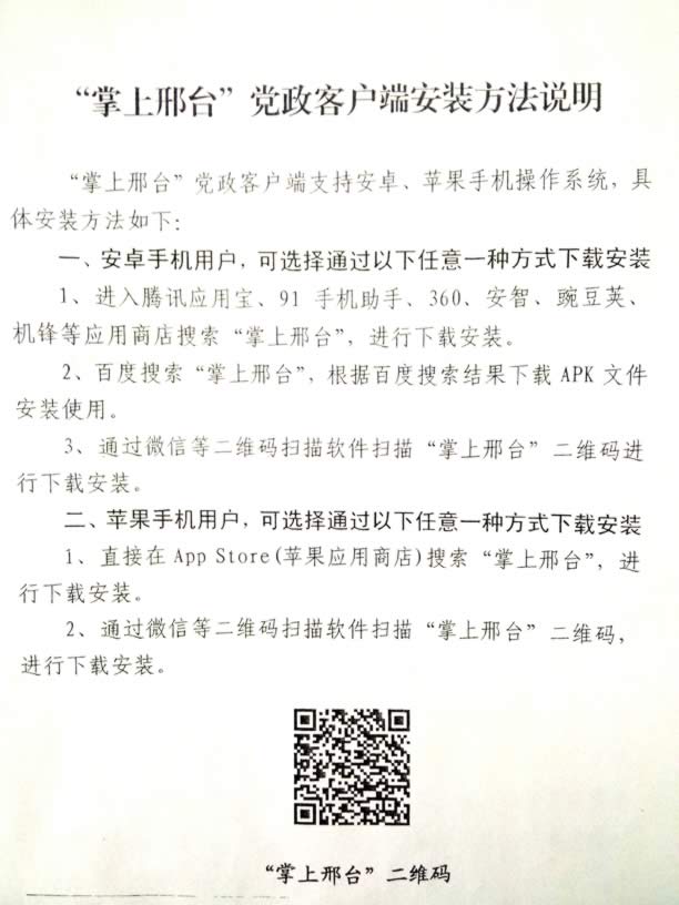 为进一步推进《掌上邢台》党政客户端建设,加大推广使用力度,按照市委宣传部、市互联网信息办、市卫生局有关文件要求,全院广大干部职工要积极为个人手机安装并使用《掌上邢台》客户端,各科室确保年底前全面覆盖本科室工作人员。现将该客户端下载及安装方法说明如下。