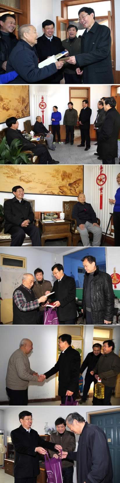 在市领导慰问结束后,我院院长、党委书记张铭连,工会主席王逢彩,老干部科科长冯虎仁等,带着精心准备的年货和全院干部职工的美好祝愿,逐户走访慰问了医院退休老干部们,送上了新年祝福。每到一处,张铭连院长都关切地询问了老干部们的身体状况和家庭、生活等情况,并亲手送上了我院承办市“第六届道德公益大讲堂”时发放的书籍和相关资料,并真诚的希望他们能讲给子孙听,以进一步促进家庭和睦、生活和谐,社会和谐。他还简要的汇报了医院今年门诊、住院人次、手术例数、业务收入、新院区投入使用后的运营情况及医院下步打算,并代表医院党政领导班子感谢他们为我院发展、建设做出的重大贡献。